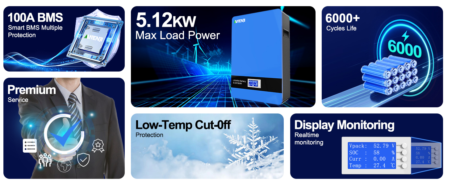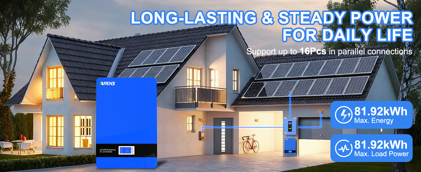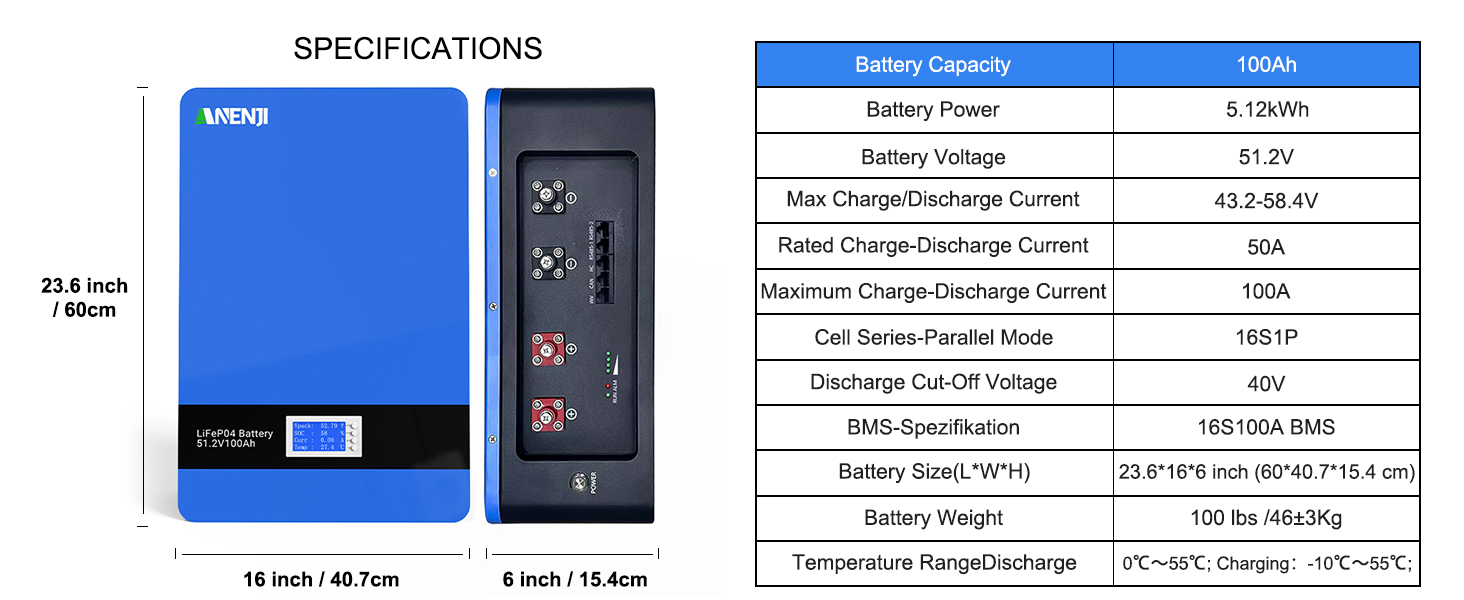 Anenji 51.2V 100Ah Powerwall LiFePO4 Wall-Mounted Battery Pack 48V 5Kwh for Solar Off/On Grid Built-in BMS 6000+ Cycles