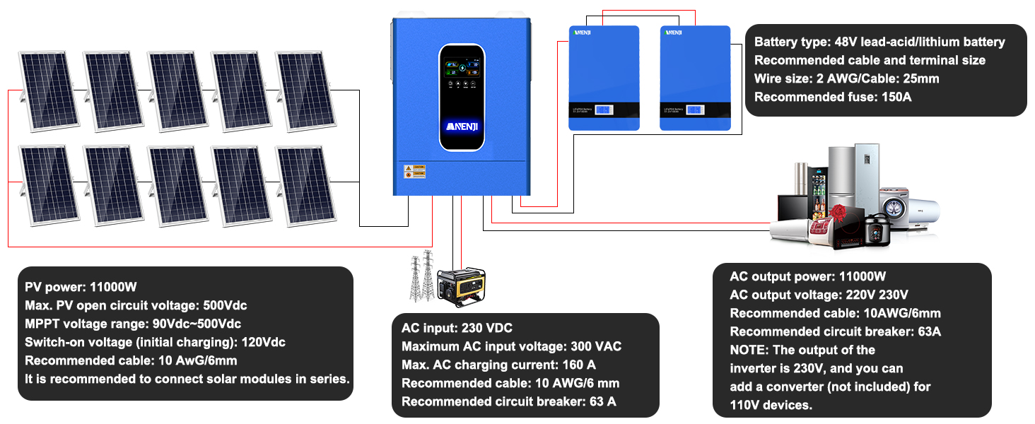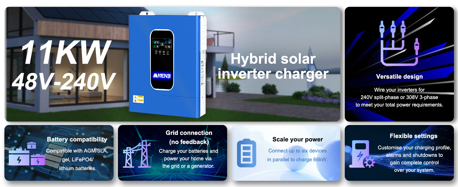 ANENJI 11KW 48V Hybrid Solar Inverter Pure Sine Wave is now available at the same price as the 10.2kW hybrid inverter, but with more powerful features.